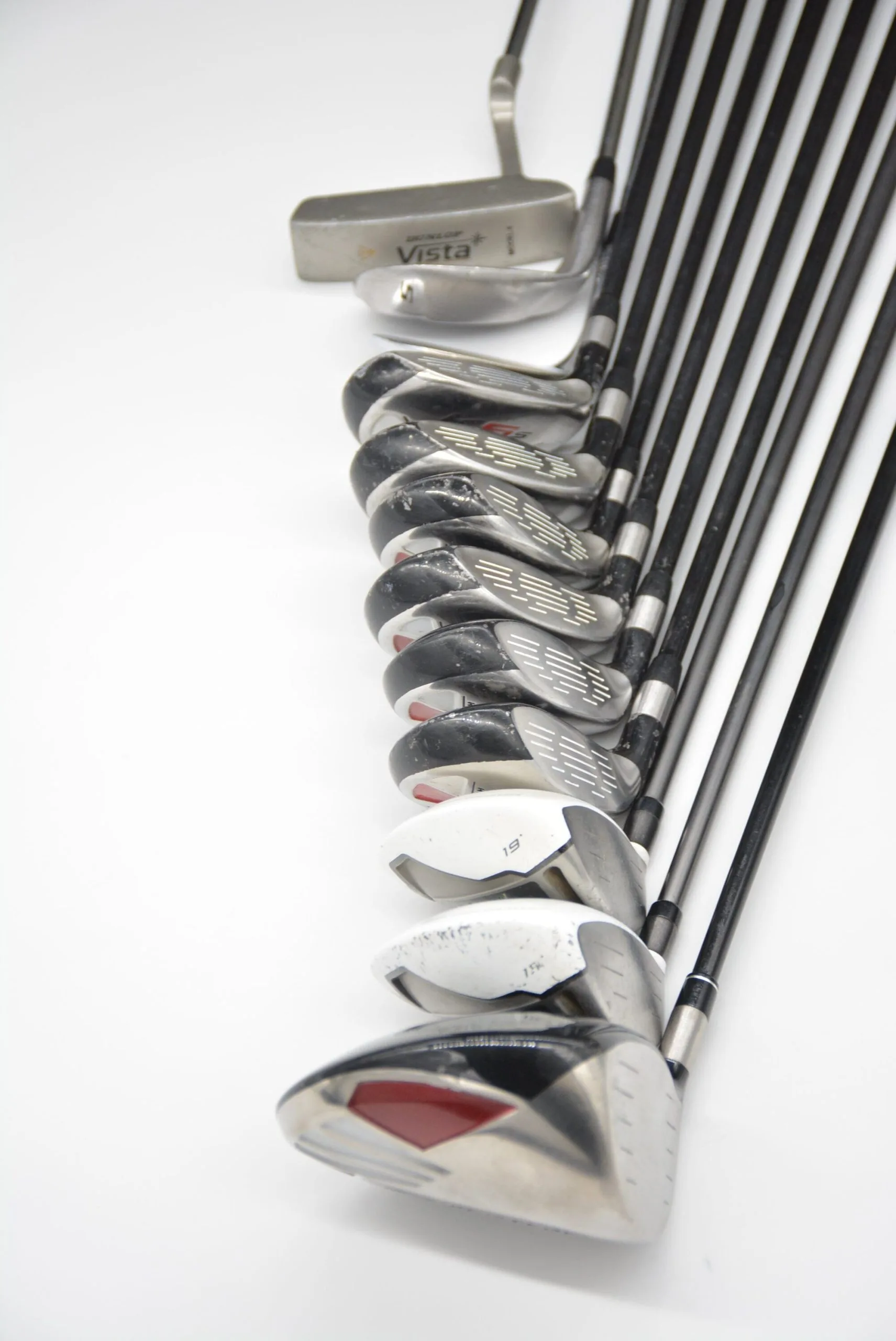Set includes Taylormade 10.5 degree Burner HT, Taylormade RBZ 3 Wood, Taylormade RBZ 5 Wood, Majek K5S Hybrid Irons 3-9 (7 clubs), Top Flit XLT 5 Iron, Wilson Staff Tour Blade Pitching Wedge, and Dunlop Vista 34in Putter. Hybrid Irons are in fair condition with wear to the heads and faces as well as scratched paint (same goes for Woods) with stock shafts in SR flex with stock grips. Item #: 5973