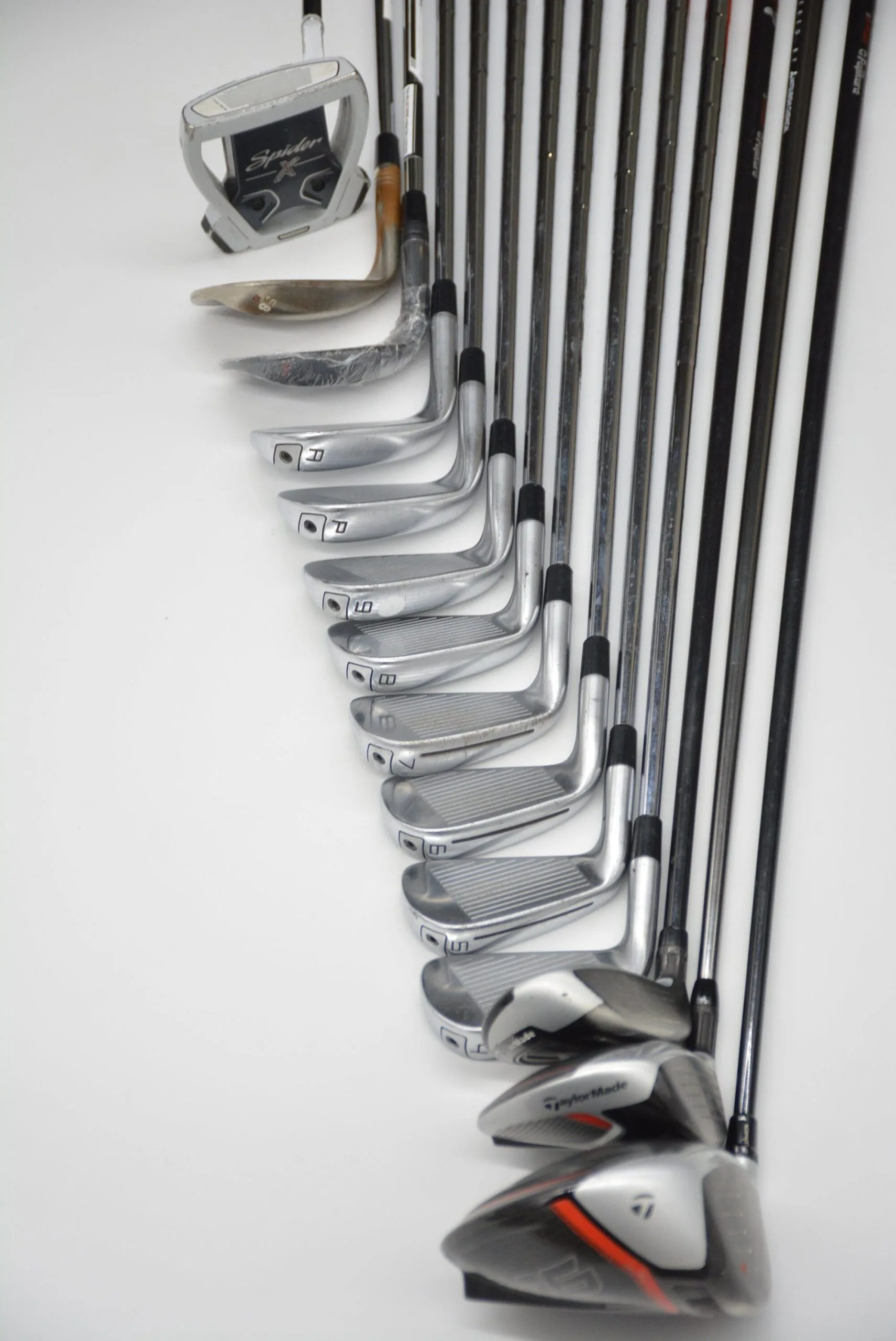 Set includes a TaylorMade M6 10.5 Degree Driver in fair condition, TaylorMade M6 16 Degree 3 Wood, TaylorMade M4 28 Degree 6 Hybrid, TaylorMade P790 4-AW Irons, brand new TaylorMade Black MG 54 Degree Wedge, TaylorMade MG Hi-Toe 58 Degree Wedge and a 35in TaylorMade Spider X Mallet Putter. Irons are in good condition with normal wear to the heads and faces. Iron shafts are N.S. Pro Modus 3 in R Flex with stock TaylorMade Golf Pride Tour Velvet grips.